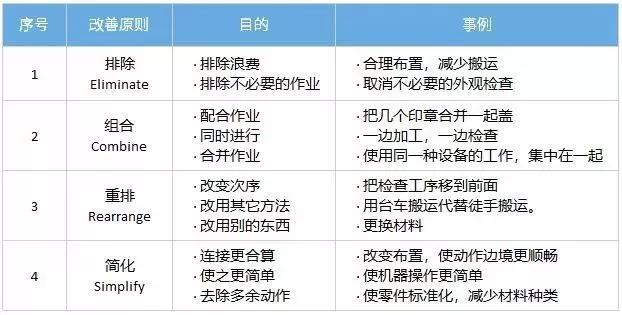 程序分析法(ECRS):整體性制造過程各作業(yè)運用剔除、合并、重排與簡化使之合理化。